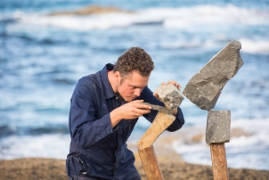 With laborious precision, he orchestrates an intimate relationship between natural forces, injecting poetry into the flow of the city through his slow gestures. His meticulous attention to these raw materials invites the public to slow down and join him in a world of stone and metal.