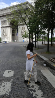Her processual march takes place on the last day of strict confinement in France. From 8am to 8pm, the artist walks, hiking stick in hand, until she reaches her final point, the Eiffel Tower, where she will plant a white flag.