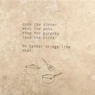 The list felt like a counterpoint to those heavy feelings I was experiencing now the art-making had begun. It simply described the care and maintenance of life, another type of essential work and labour, but one that happened daily behind closed doors. Perhaps what I was doing with this piece was making public a series of everyday acts of care (usually performed in private)?