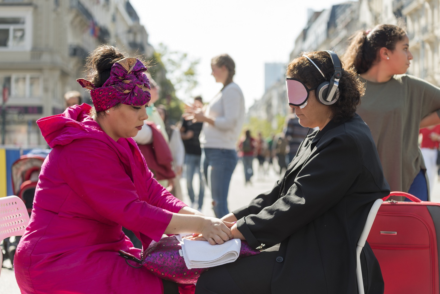 Dans ce "Beauty Verhalen Salon", les passants sont invités à s'arrêter à la table de ces femmes le temps d'un soin des mains, tout en écoutant ces récits, les yeux bandés.
