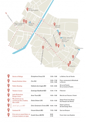 La programmation dans l’espace public se concentre cette année sur l'axe qui relie la place de la Bourse, lieu symbolique depuis les événements de mars, et Molenbeek, commune conspuée par la communauté internationale de manière fantasmatique. Les œuvres reflètent les préoccupations abordées lors des débats et ateliers au travers de créations urbaines d’artistes belges et internationaux.