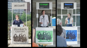 Allusion au Speaker's Corner de Londres, le Thinker's Corner est une expérience d'art vivant et de savoir partagé dans l'espace public. Interrogeant notre société à travers des pensées actuelles ou anciennes, toujours innovantes, il revisite nos idées reçues en utilisant le mode du contre-pied.