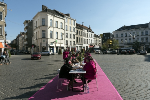 Pour الكفاح من أجل السلام (Striving for Peace - Lutte pour la paix), Elvira Santamaria conçoit une action déambulatoire qui va de la Bourse vers Molenbeek, action portée par le vent et les éléments. Un geste de paix symbolique s'offrant comme un autre référent pour une jeunesse en mal de modèles positifs.