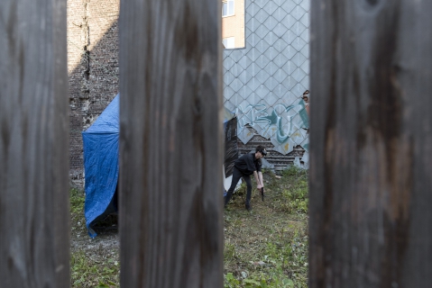 Dans une installation multimédia dans laquelle la dystopie aurait pris le pas sur l’utopie, un performer protège une cabane de fortune d’un ennemi invisible.